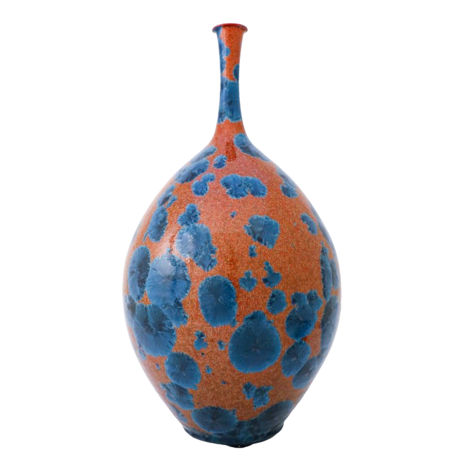 A large stoneware vase with a lovely blue crystaline decor. The vase is 44 cm (17.6″) high and in mint condition.  This is a technique that only a few person in the world masters.