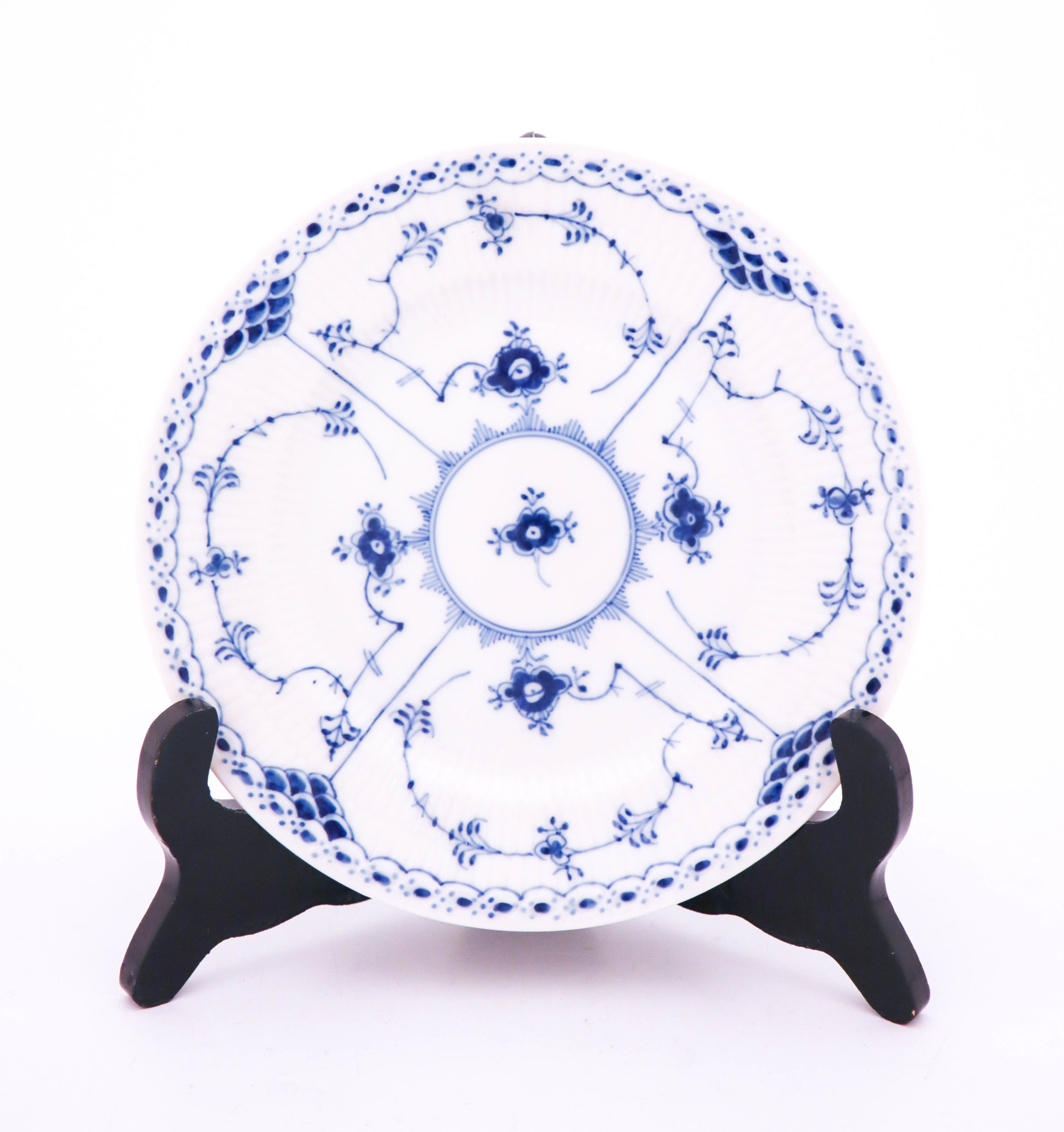 A small plate of Blue Fluted model-number 574, half lace from Royal Copenhagen. The plate measure 17.5 cm in diameter. It´s mint condition and 1:st quality. Observe that the plate you order can differ from the actual picture, in color and year of production since they all are hand-painted.