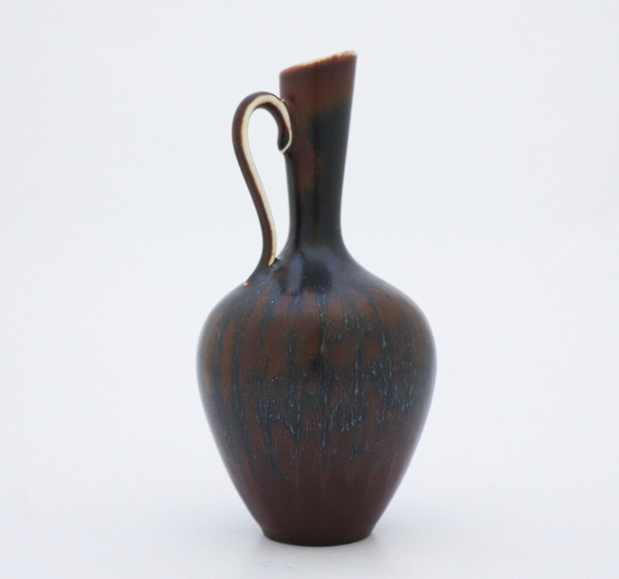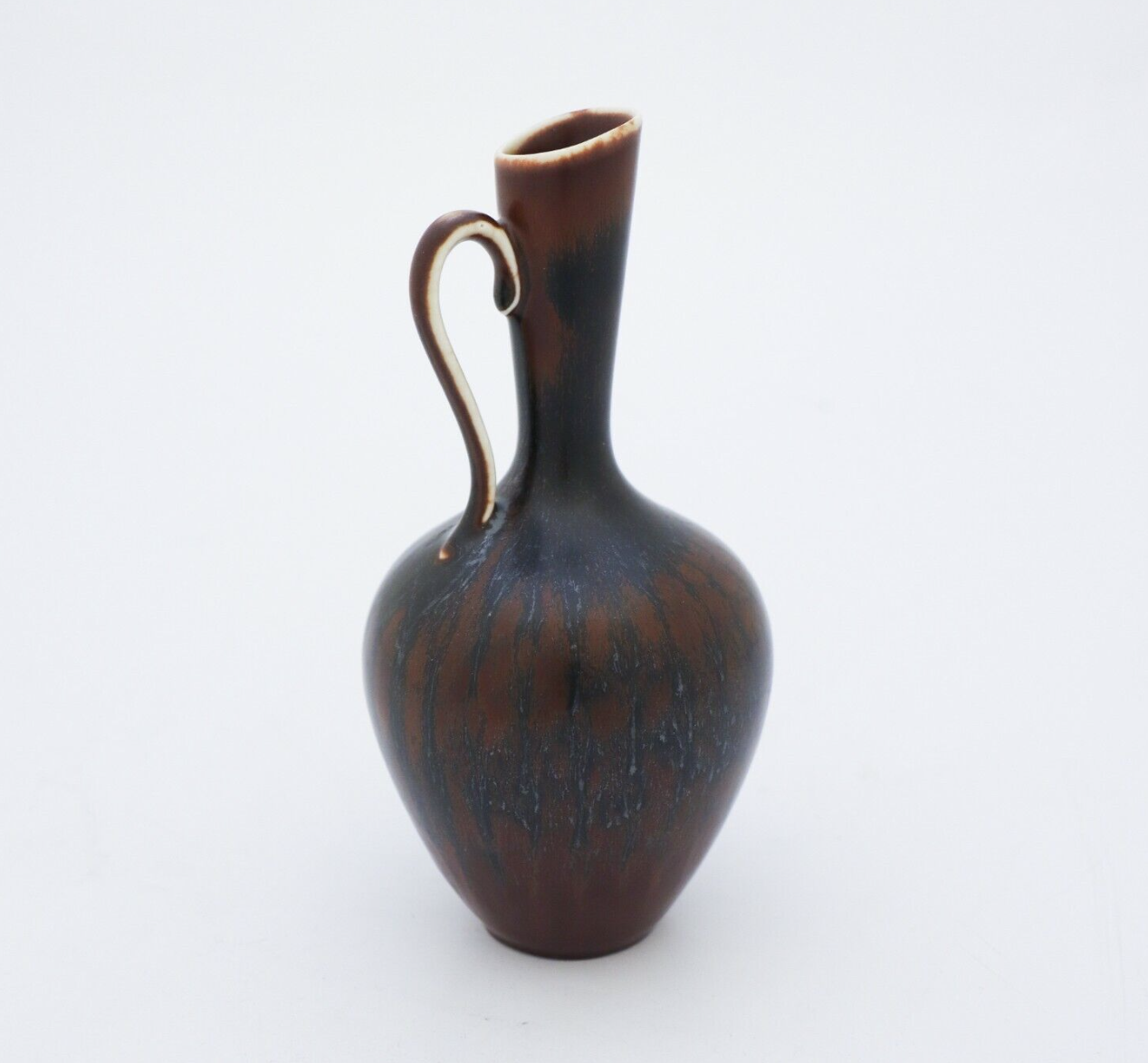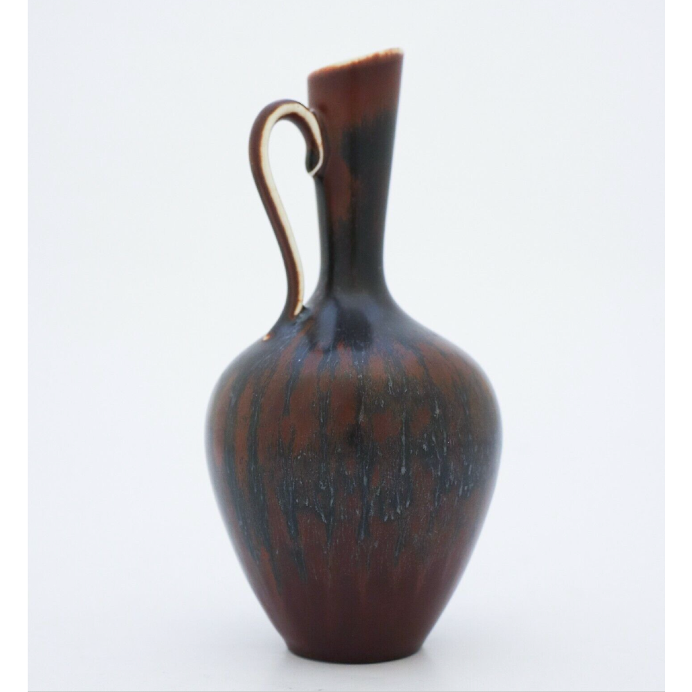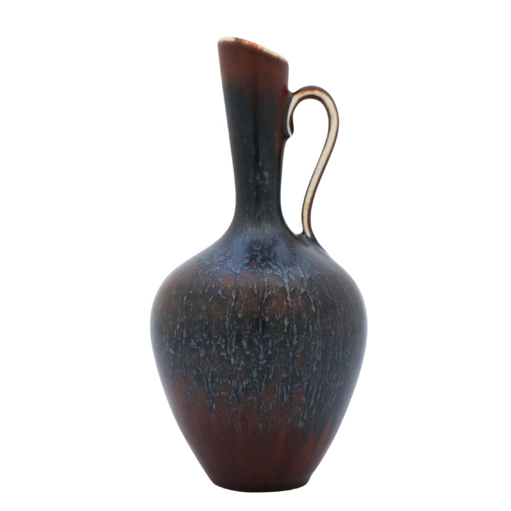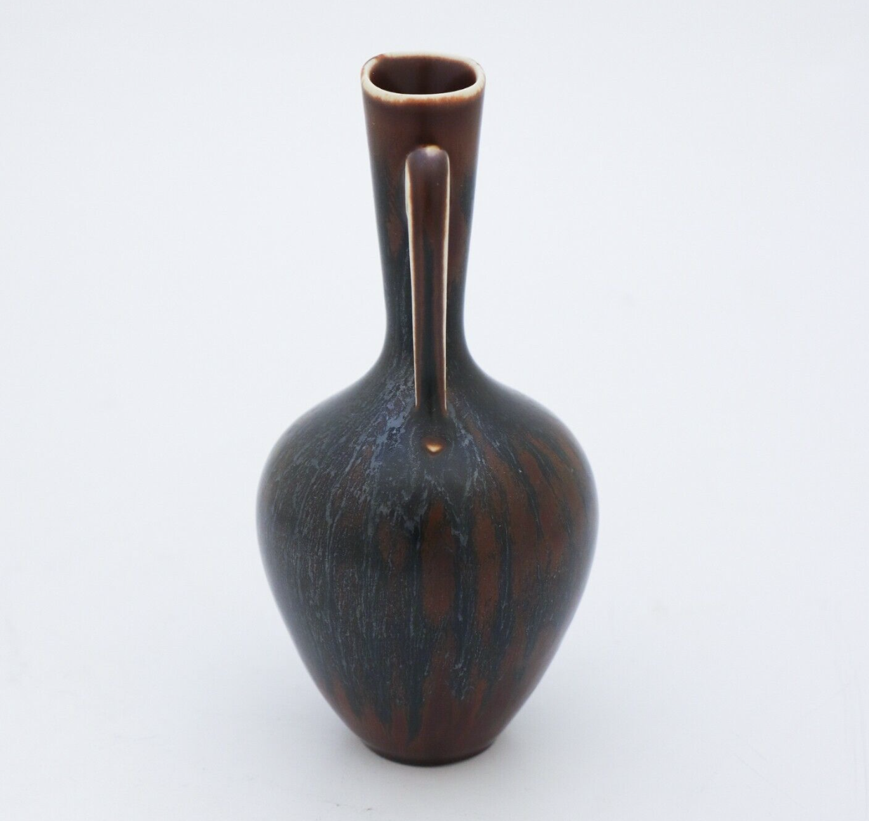 A dark vase (black & brown) with a lovely glaze designed by Gunnar Nylund at Rörstrand, it´s 17,5 cm (7″) high. It´s in mint condition and marked as 1st quality.