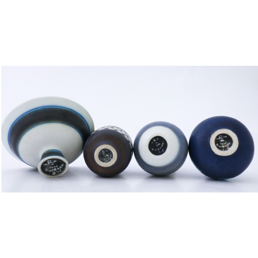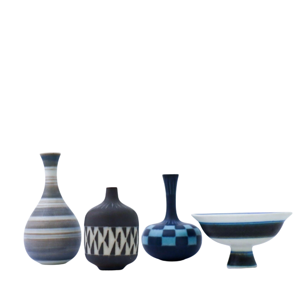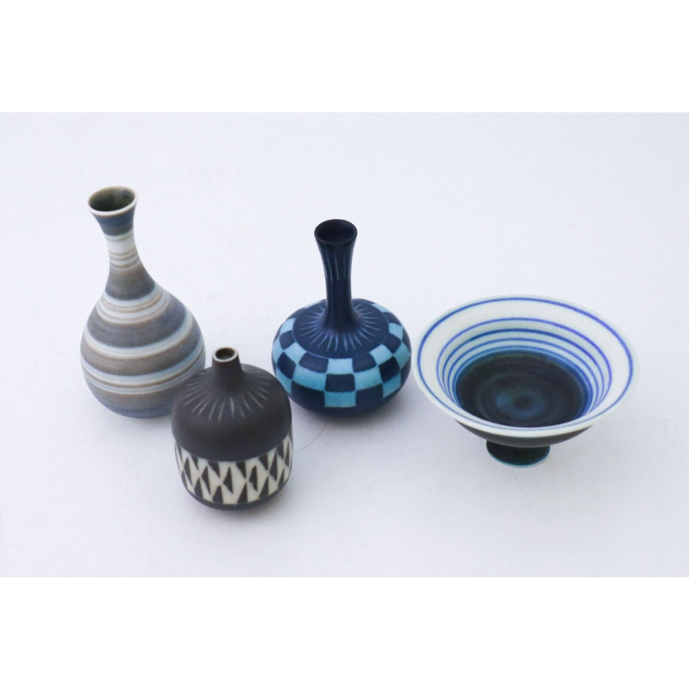 A group of three vases and one bowl with a lovely pattern designed by Gunnar Nylund at Rörstrand, the vases are between 6.5 – 9 cm (2,6″ – 3.6″) and the bowl is 8 cm (3.2″) in diameter. They are all first quality except from the blue vase with squared decor that is 2nd quality. They are in excellent condition.