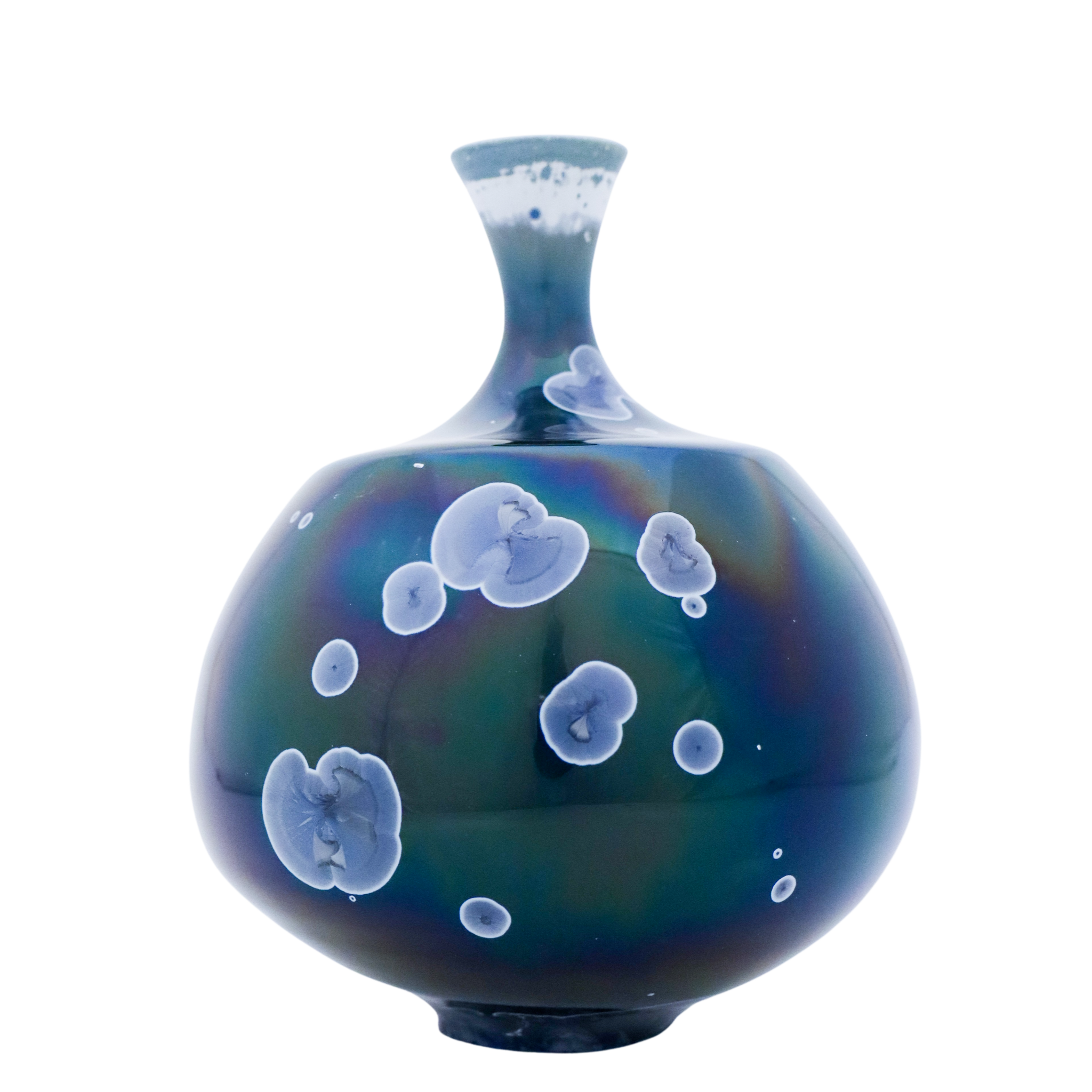 A unique vase in a Dark Blue metallic-tone with a lovely crystalline glaze created by the contemporary Swedish artist Isak Isaksson in his own studio. The vase is 15.5 cm (6.2″) high and in mint condition. Isak is one of the most well known contemporary ceramic artists in Sweden. The glaze is made with cobalt oxide and bismuth nitrate and then the vase is reduction burned which means that the oxygen in the oven to create this magnificent glaze. This is a technique that only a few person in the world masters. The crystals are almost like planets in a universe.